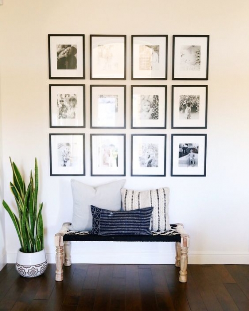 One way to simplify this daunting task is to eliminate the need to work together with works of art in different sizes and styles. A simple grid that repeats frames of the same size, color, and style is a great way to create a classic wall that only leaves you to decide which photos to put on display.