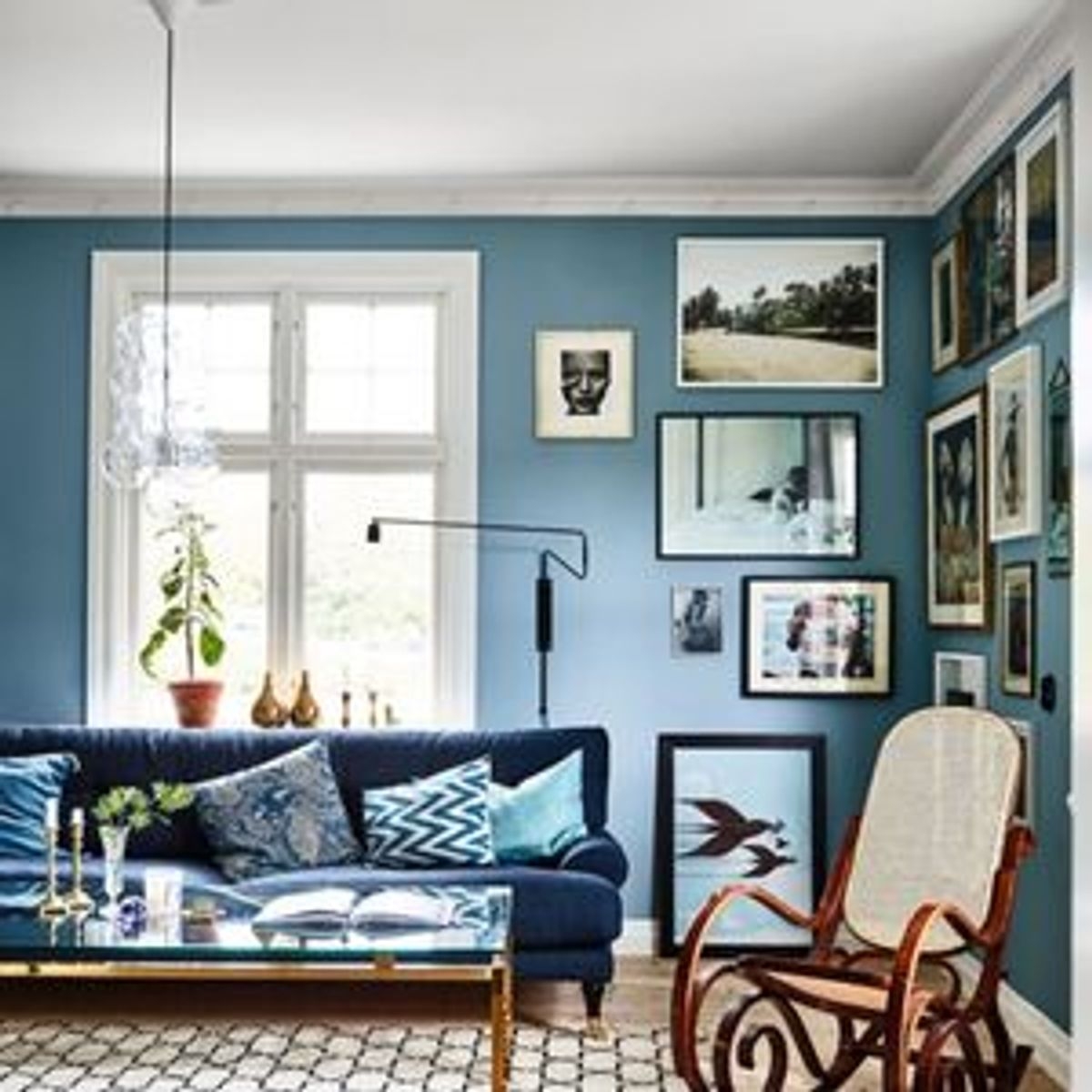 Blue can have an effect on how a room feels. It can set the mood in both subtle and dramatic ways - blues with grey tones can have a calming and soothing effect, dark and navy blues can anchor a room, and royal blues can add an expressive pop of color. Blue can also be a perfect backdrop color for a monochrome or multi-style gallery wall. Shades of blue work beautifully with black, white, gold, silver, and an array of colored frames which makes it the perfect go-to wall color when you're on the fence about selecting the perfect paint color.