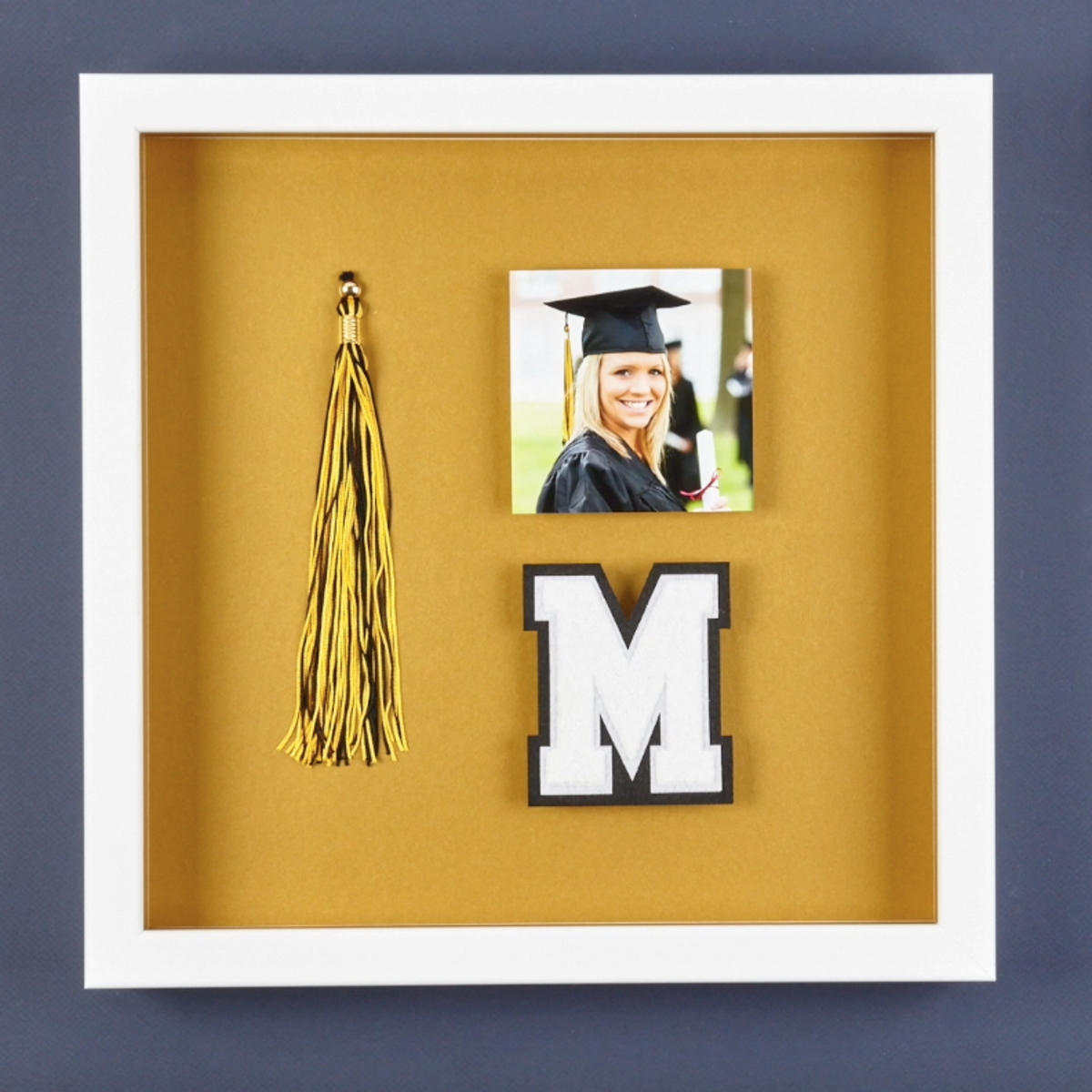 Our instructional video below will provide you with a step-by-step guide on how to frame your tassel, graduation picture, school insignia, and any pieces from your graduation that you want to put a spotlight on.